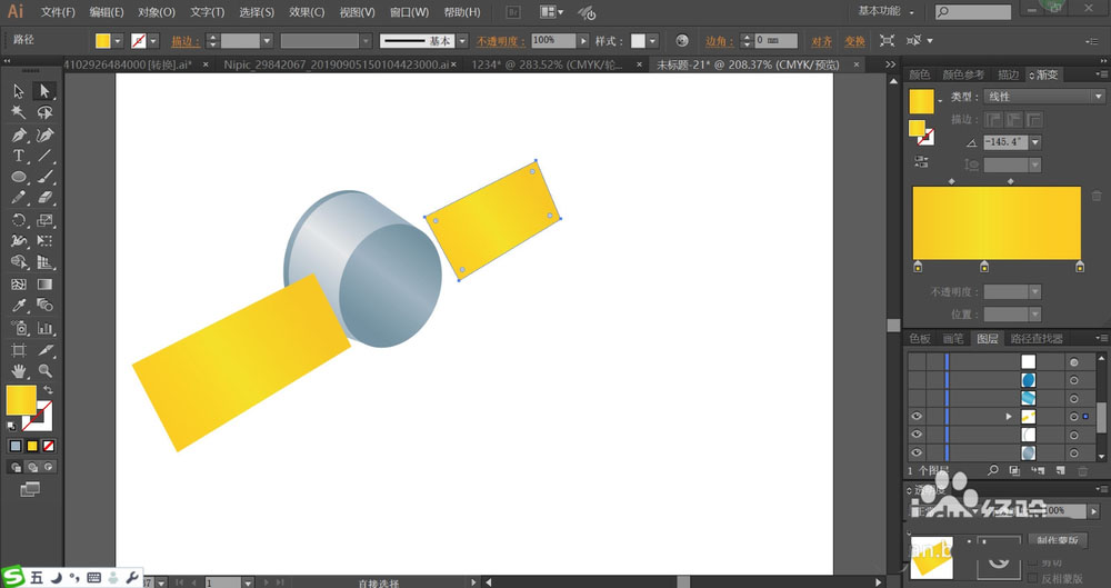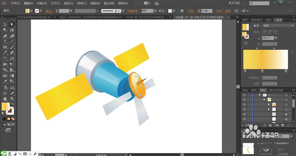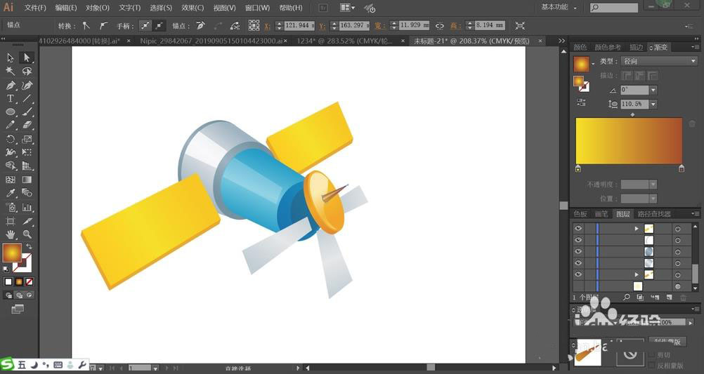 2、使用灰白色与蓝灰色的渐变搭配填充飞行器的圆柱结构,再用橙黄色的渐变填充它的两个大翅膀路径。