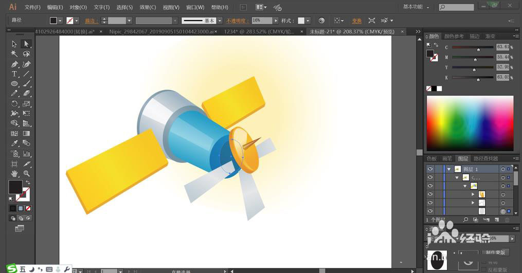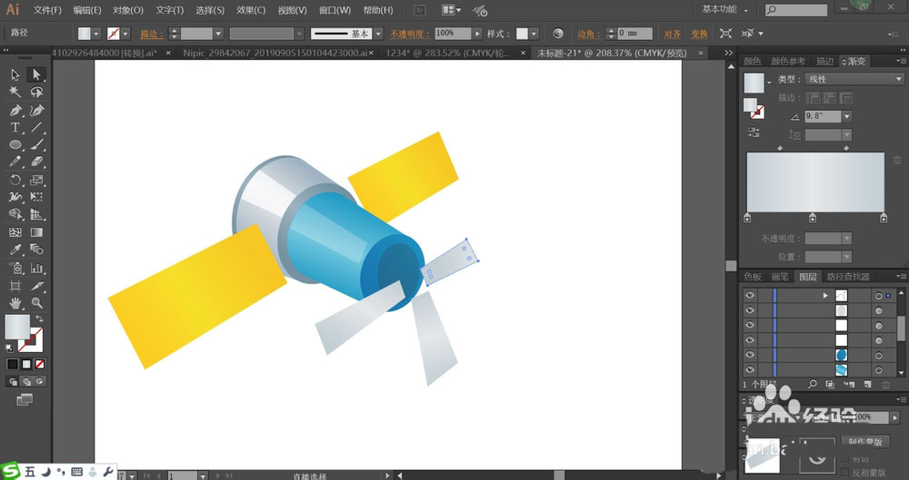4、这一步,我们用半透明的白色填充飞行器上面的高光区域路径。上方灰色结构件上透明度为70%,下方蓝色上面的白色的透明度为22%左右。