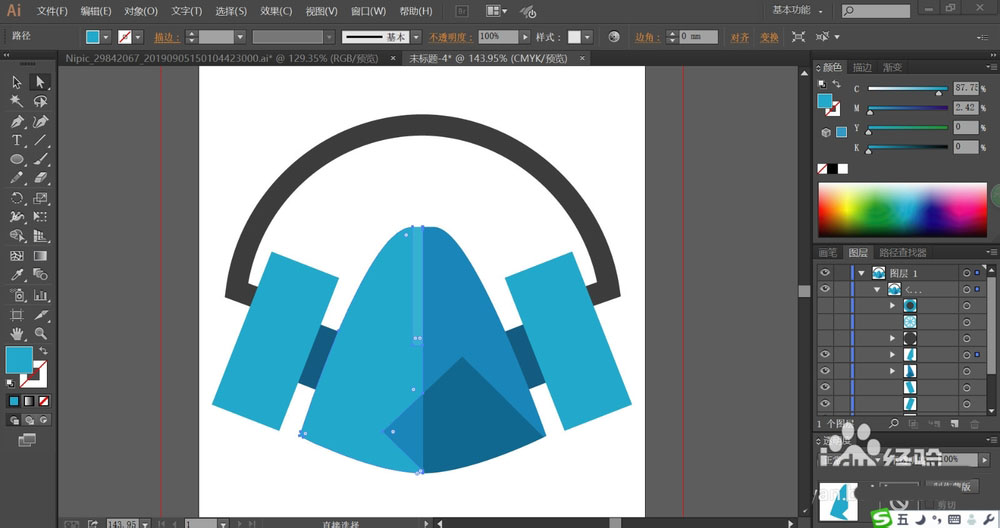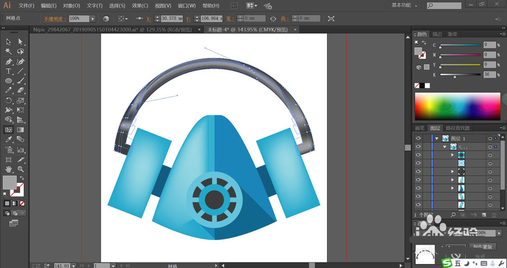 6、使用网格工具点击一下防护面具的支架让其呈现灰黑色渐变效果,点击一下蓝色结构件让其呈现蓝色渐变的效果。