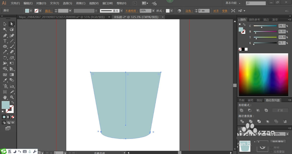 2、设置前景色为蓝灰色,我们用蓝灰色填充纸桶的正面,再设置背景色为天蓝色。