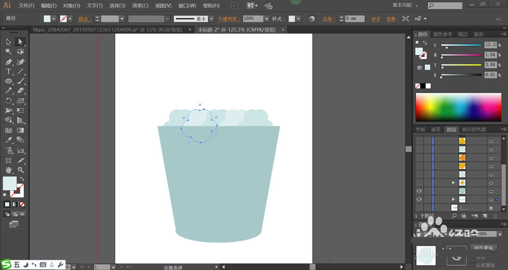 3、我们用蓝灰色与天蓝色搭配填充纸桶上面的各个爆米花的路径,让其交替呈现光亮的明暗效果。