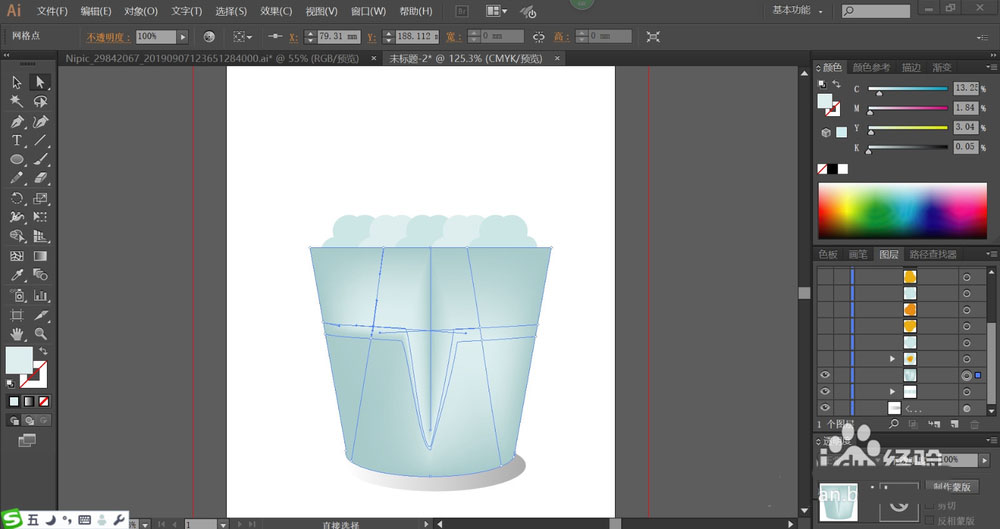 4、这一步,我们用网格工具点击纸桶,让纸桶正面呈现蓝灰色的渐变效果在中间。在纸桶的下方画出圆形阴影,我们用半透明的灰黑色渐变填充。