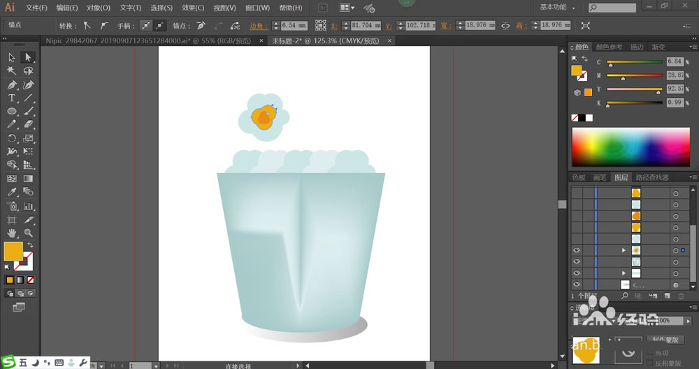 5、我们用橙黄色与橙色、天蓝色搭配填充纸桶上方的单颗爆米花,让其色调从黄到蓝变化。