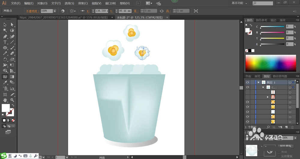 6、用同样的方法绘制三颗大小不同的爆米花在纸桶的上方。我们使用网格工具点击一下爆米花的中间的橙色、橙黄色、天蓝色,让其呈现渐变色效果。