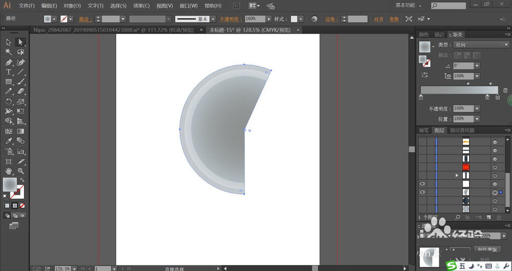 2、用灰色的径向渐变填充半圆形的结构件,再用柔光模式的白色填充左侧边缘的圆弧路径,透明度为33%左右。