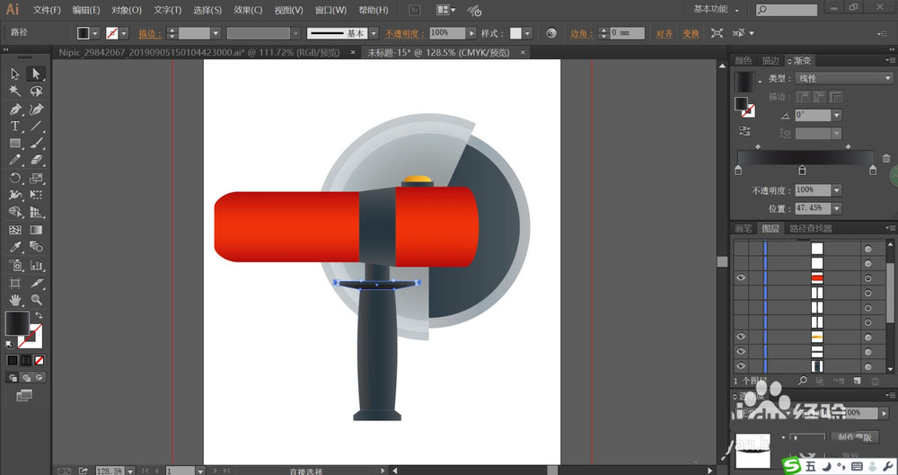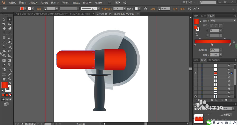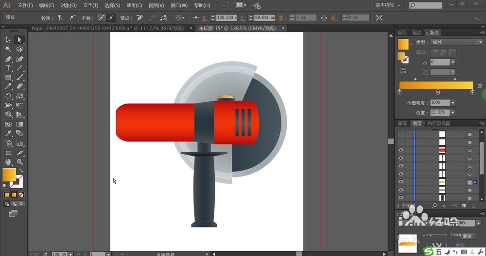 4、这一步,我们使用朱红色的渐变填充电锯的中间圆柱结构件,让圆柱中间呈现高光效果。