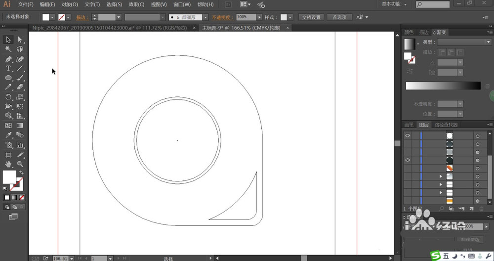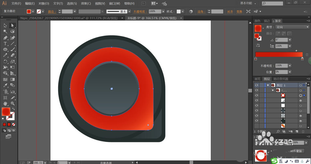 4、设置大红色的渐变放在小圆形与大圆形的中间区域,让小圆形在红色渐变的上方。