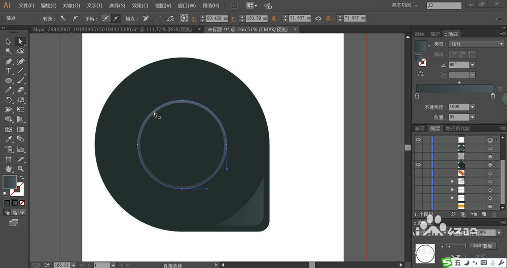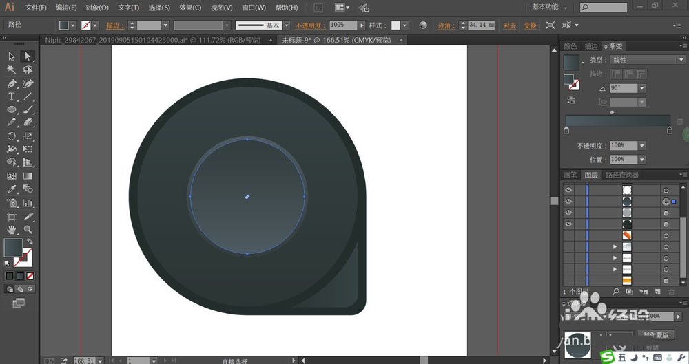 3、接着,我们用较亮的青黑色的渐变填充卷尺的内部小圆形,再调整一下亮度用青黑色的渐变填充卷尺的内部的大圆形,让小圆形在大圆形的上方。