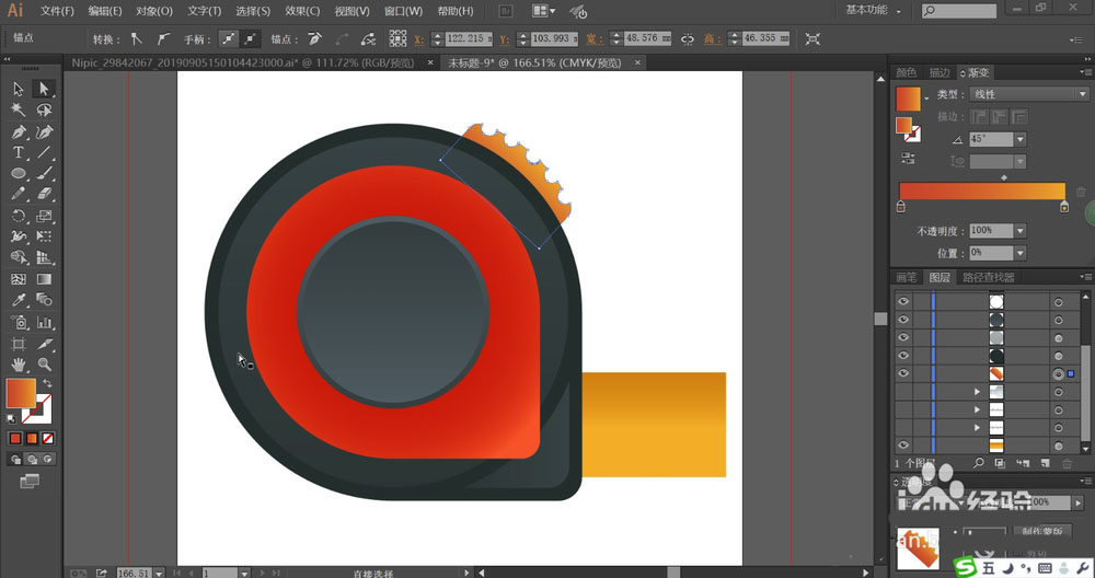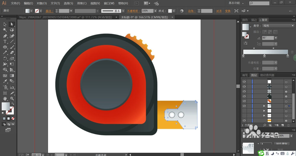 5、接着,我们画出卷尺的右上方的结构件与右方伸出的卷尺,我们用橙黄色的渐变填充。