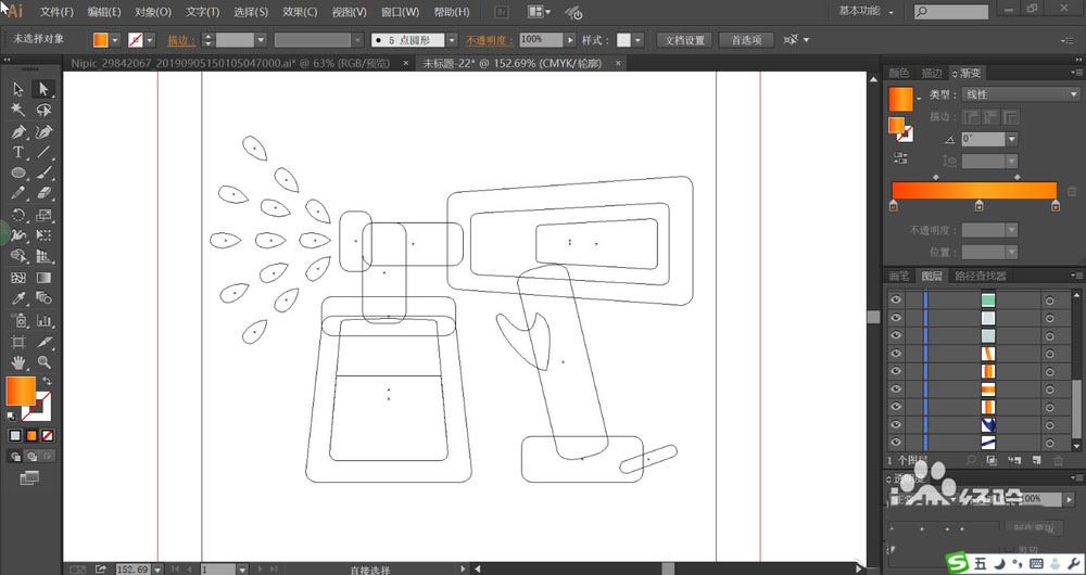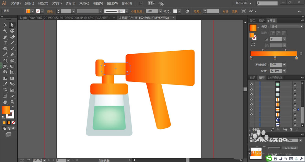 4、这一步,我们用橙色的渐变填充喷雾器的管状结构件的路径,让其呈现橙色立体效果。
