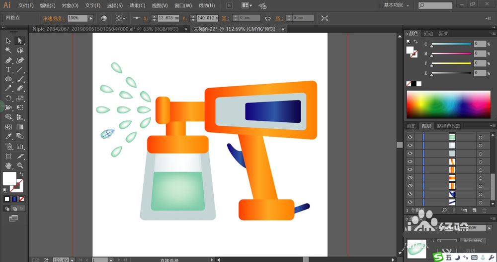 6、继续使用青色填充喷雾器前端出来的液体路径,并用网格工具一一点击让其呈现青色的渐变效果。