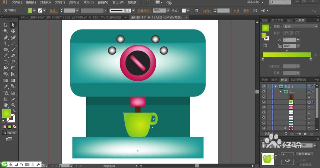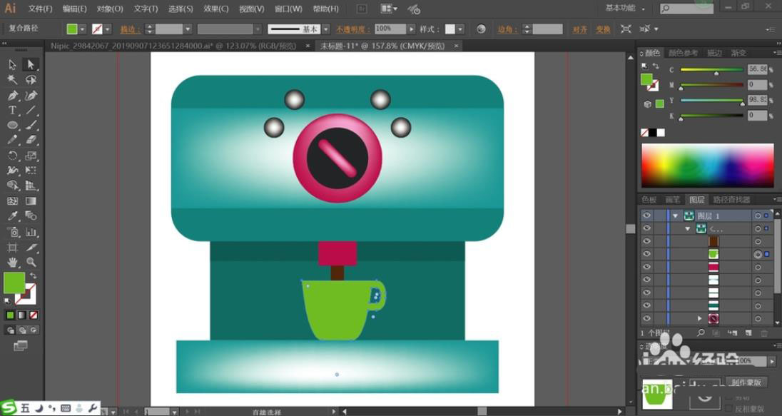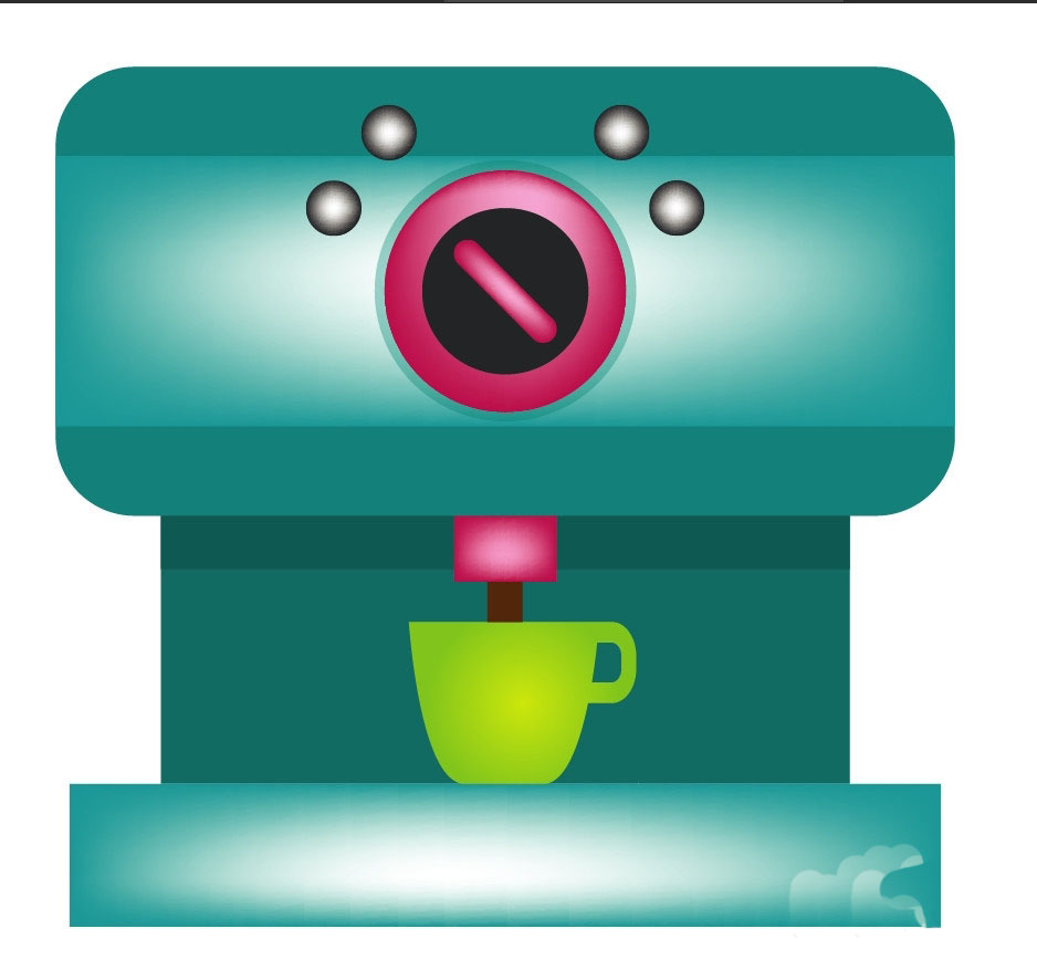 7、最后,我们用翠绿色填充杯子,用粉红色填充机器的出口,用咖啡色填充出来的液体咖啡,再用网格工具点击一下杯子让其呈现翠绿色的渐变效果,完成咖啡机图片设计。