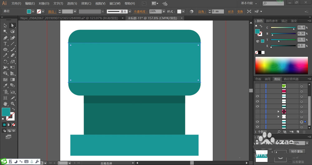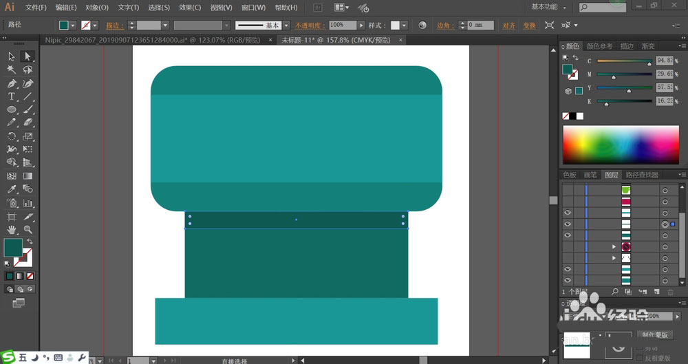 3、用暗青绿色填充机器的下面结构件,最底部用淡青绿色填充。