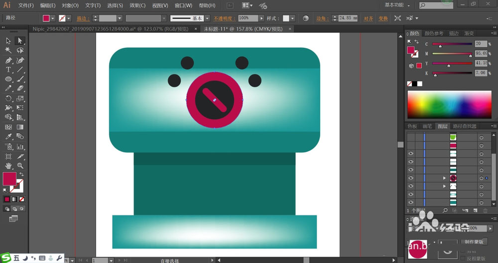 5、接着,我们用灰黑色填充机器上面的圆形结构,机器上方的按钮用圆形与矩形组成,分别填充粉红色与灰黑色。