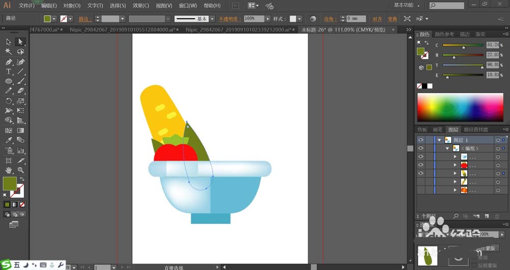 5、继续使用黄色与绿色搭配填充玉米的基本路径,让其主体为黄色,下方的茎叶为暗绿色。