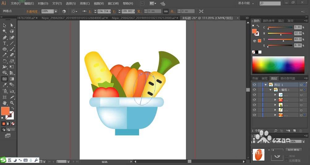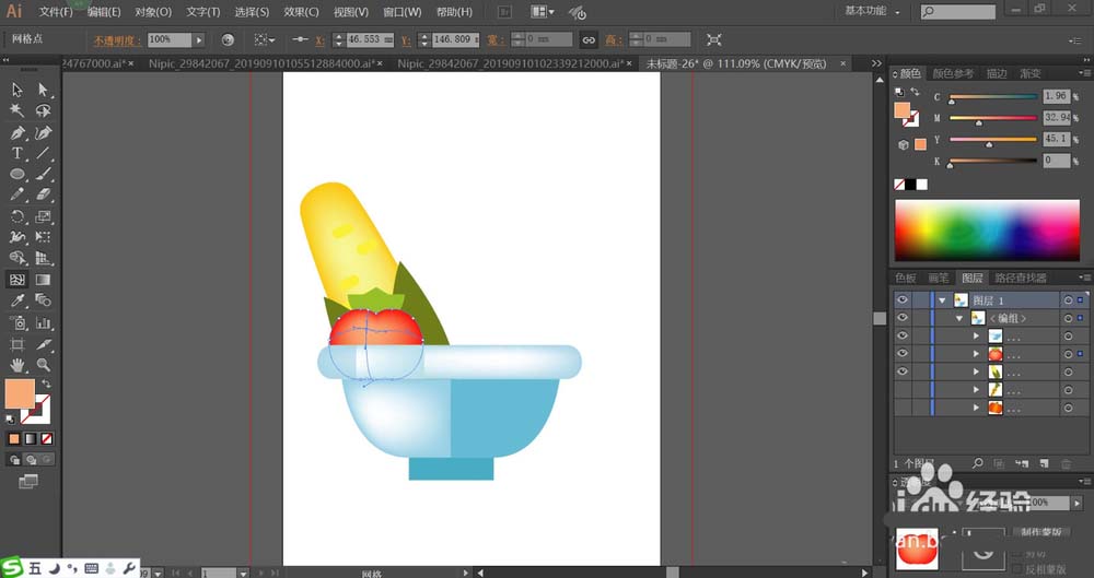 6、接着,我们用使用网格工具点击一下西红柿的主体让其呈现红黄色渐变效果,再点击一下玉米的主体让其呈现黄色渐变的效果。