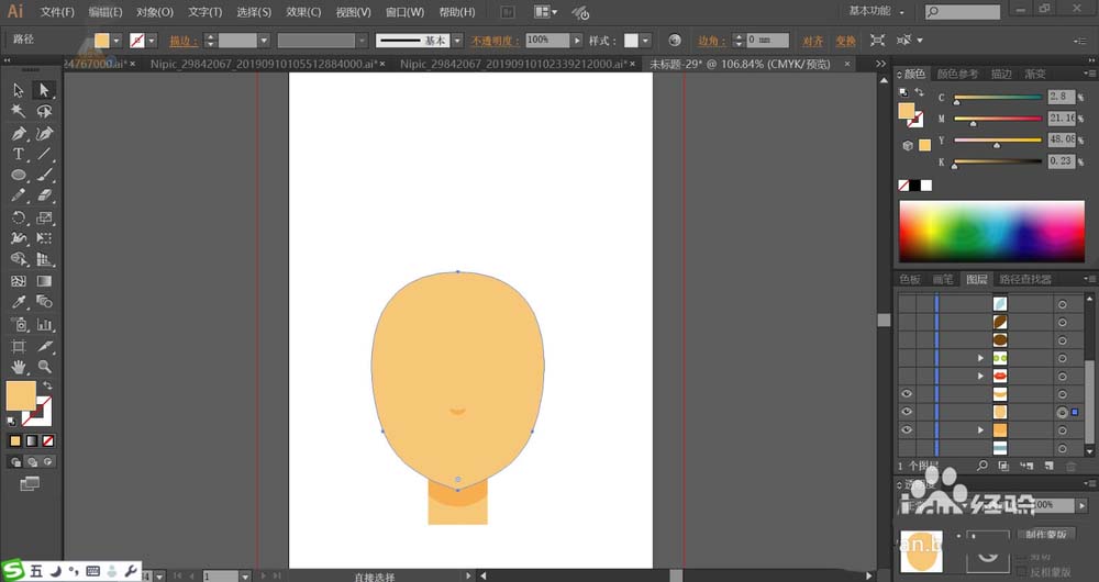2、使用明暗不同的粉黄色分别填充女孩的脸蛋主体与脖子,在脖子上方为暗光区域。