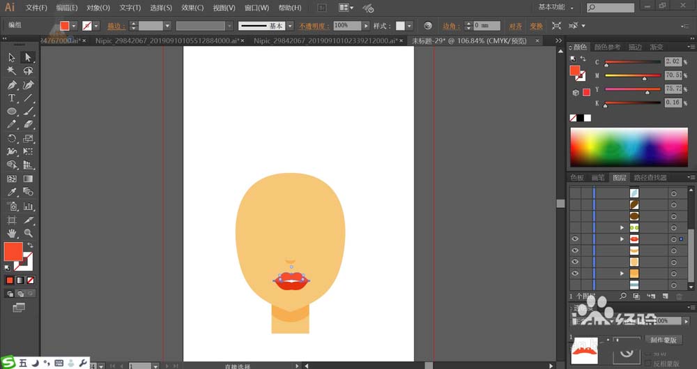 3、接着,我们用两种不同的梅红色填充女孩的嘴唇,上嘴唇为高光效果。