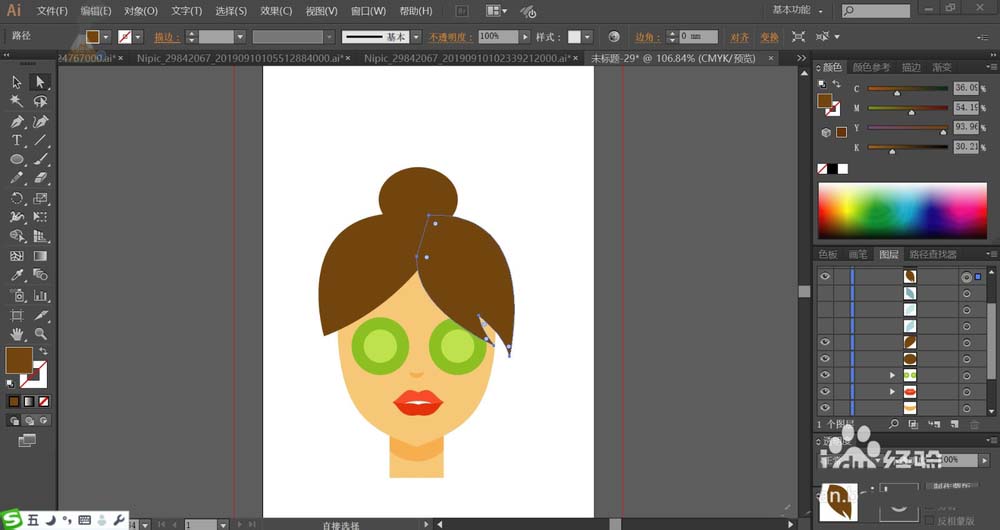 5、接着,我们用褐色填充女孩的头发路径,脸部的鼻子用暗粉色填充。