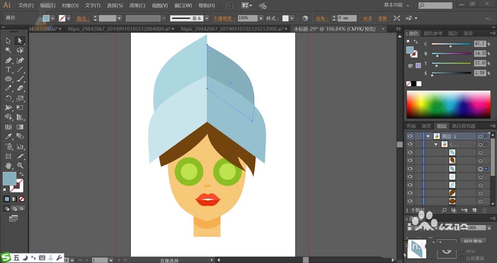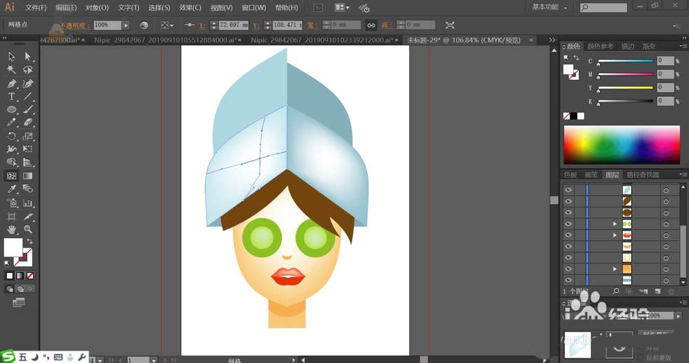 7、最后,我们用网格工具点击一下女孩头上的毛巾高光区域让其呈现天蓝色渐变效果,再点击一下女孩的脸蛋让其呈现粉黄色渐变,点击嘴唇上方让其呈现梅红色渐变效果,再点击一下黄瓜片的中间让其呈现草绿色渐变效果,完成美容图片设计。