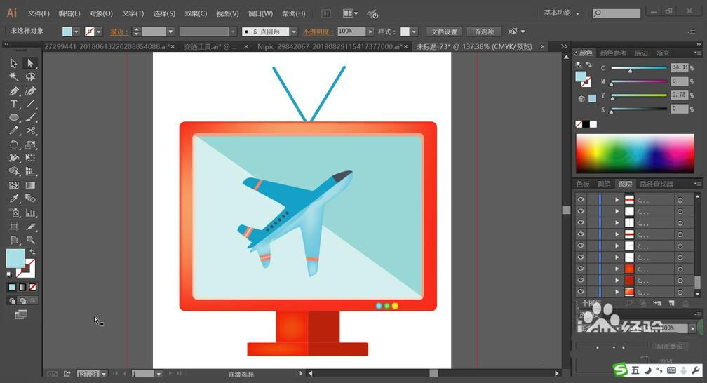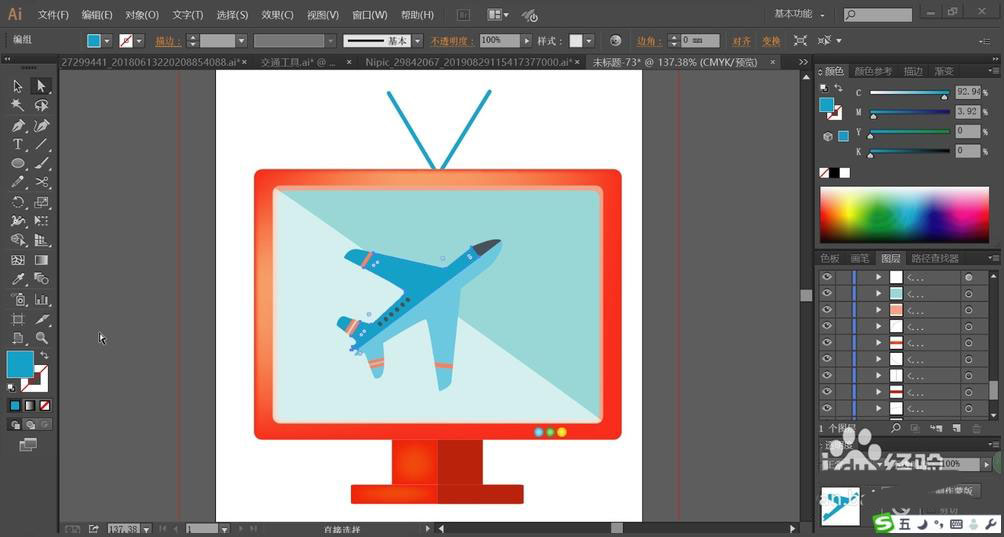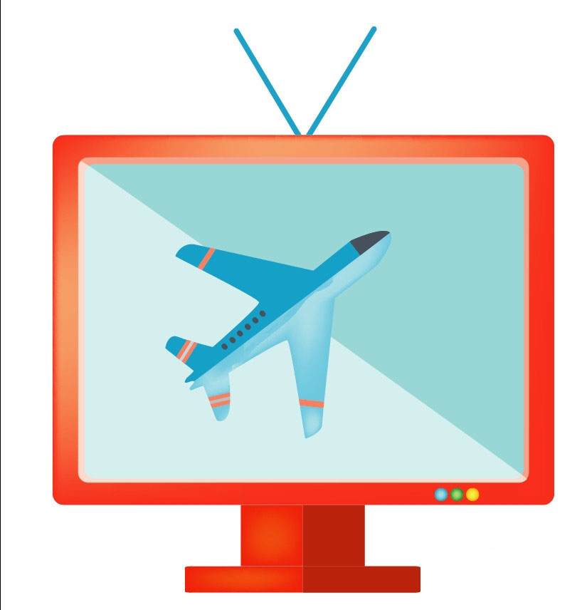 7、最后,在电视机的屏幕上面画出飞机的形状,我们用深蓝色与天蓝色搭配填充填充飞机的左侧与右侧,再用桔红色搭配填充图案,使用网格工具给飞机的右侧高光区域做出蓝色渐变效果,用天蓝色填充电视上方的两根天线,完成电视机图片设计。