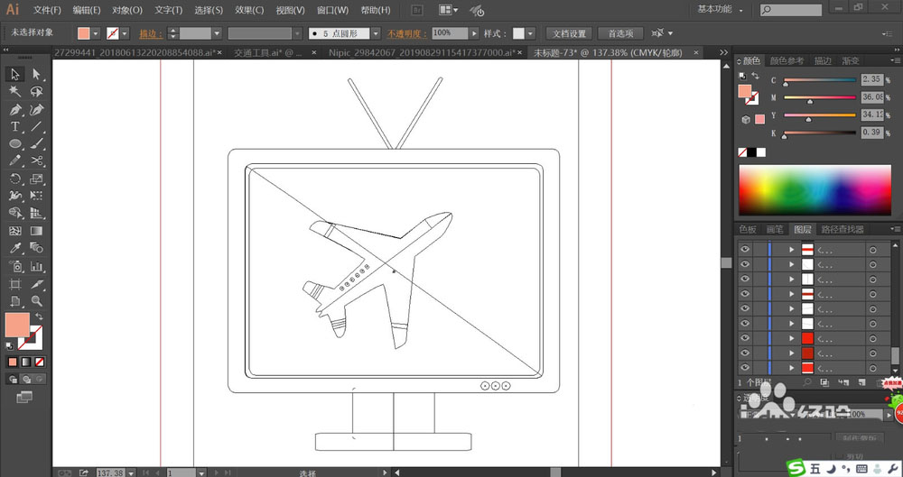 1、先用矩形与圆形分别画出电视机的屏幕与下方的圆形按钮的路径,再使用钢笔画出电视机屏幕上面的飞机形状的路径。