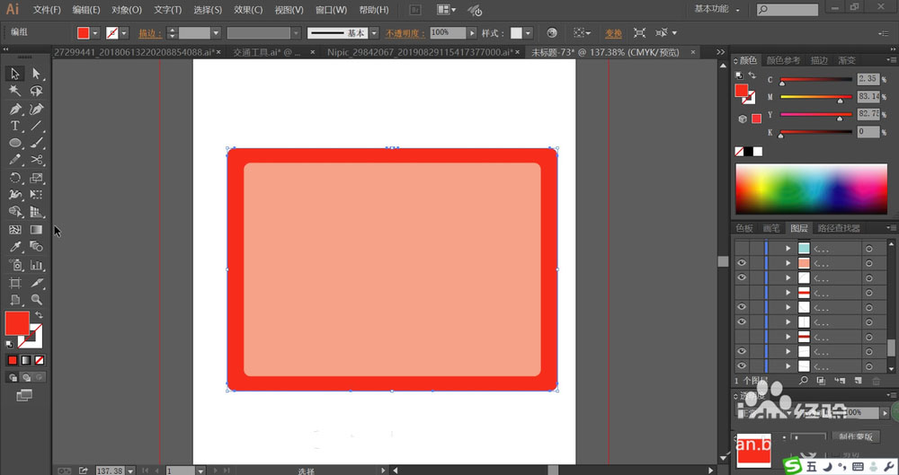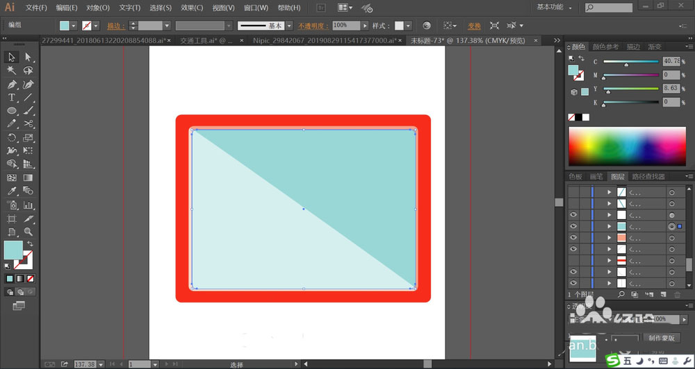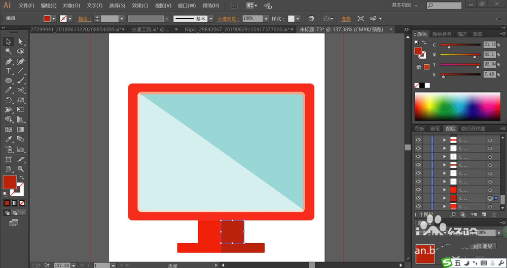 4、电视机下方的支架用大红色与暗红色分别填充左侧与右侧,从而形成一种光线的变化。