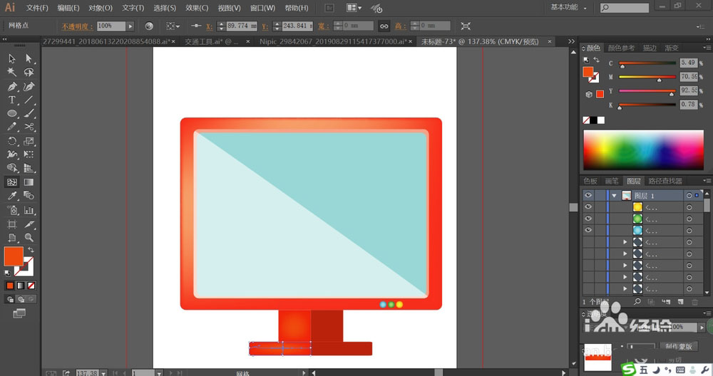 6、选择网格工具点击一下电视机的边框让其产生红色渐变在左侧高光区域,点起一下圆形按钮制作各自的渐变色。再点击一下电视机的支架左侧让其产生红色渐变效果。