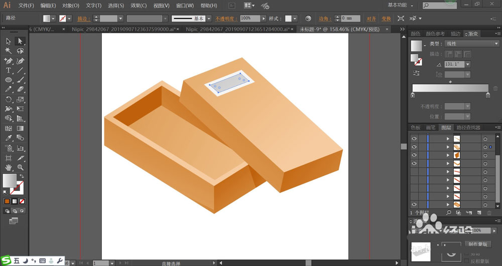 2、接着,我们用米黄色的渐变填充盒子的各个侧面,在暗光区域用反向渐变色填充出暗光效果。