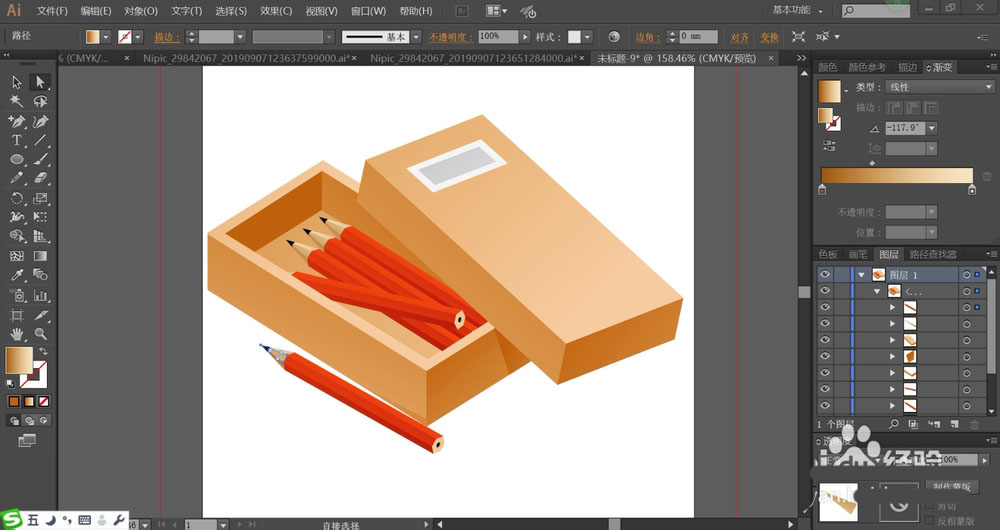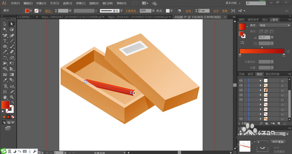 4、使用钢笔画出盒子内部的铅笔路径,我们用大红色的渐变与黄棕色的渐变搭配填充。