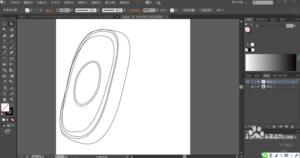 1、使用圆形工具画出手机支架的正面轮廓并用钢笔调整工具进行节点的调整让其成为一 个椭圆形状,复制这个椭圆并放大或者缩小,从而让其成为内圆形与外圆形的结构件。