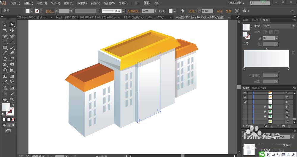 2、使用灰色的渐变填充楼房的侧面,再用灰白色的渐变填充楼房的正面,让楼房的正面呈现高光效果,正面的窗户用灰色的渐变填充。