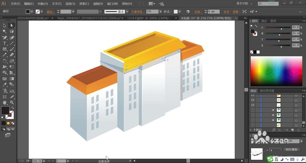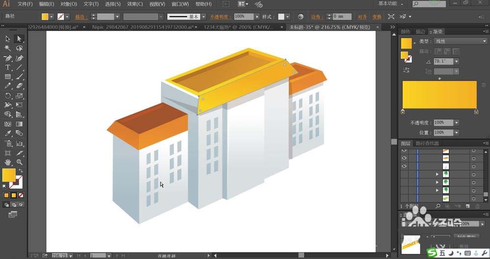 3、我们使用橙黄色的渐变填充楼房的楼顶,再用暗橙色的渐变填充两侧楼房的楼顶。楼顶的高光用橙黄色的渐变填充,暗光直接用半透明的暗橙色填充。