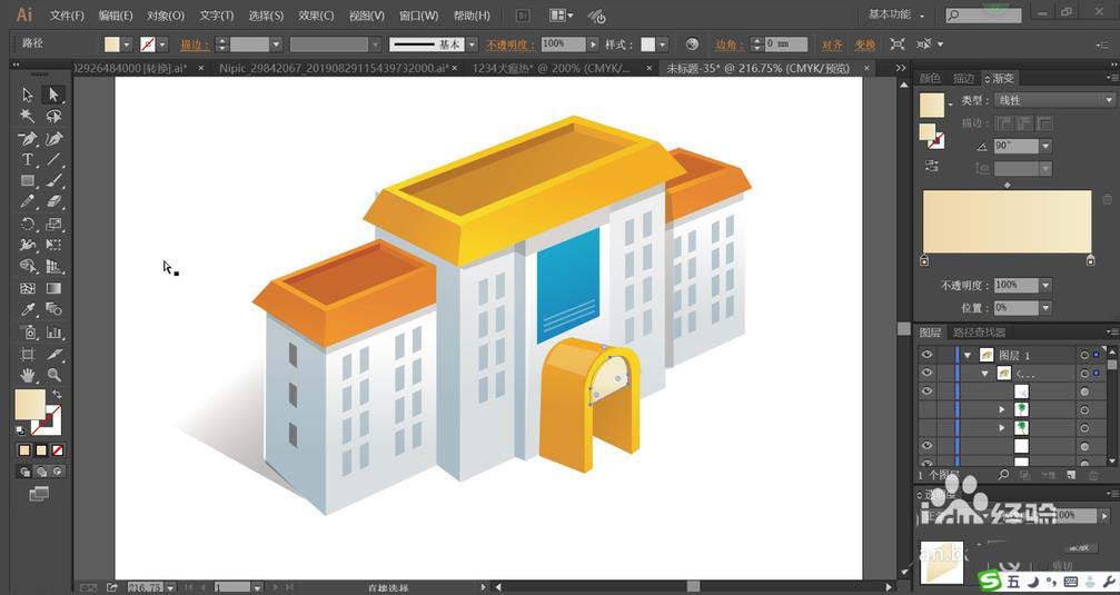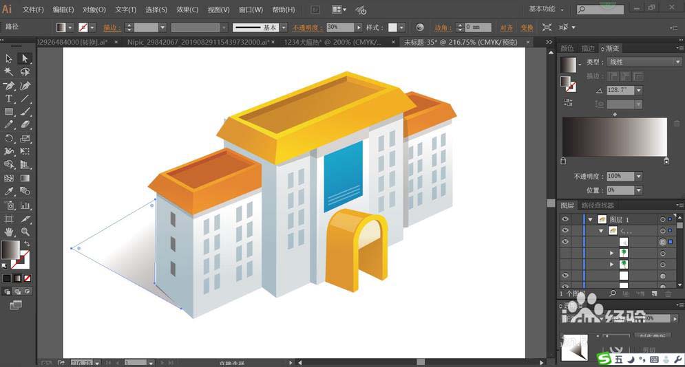 4、接着,我们画出楼房的正面的拱门并用橙色的渐变填充,高光用半透明的白色与灰白色的渐变分别填充,拱门上方的墙壁用蓝色的渐变填充。