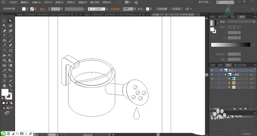 1、用钢笔工具画出花洒的手柄、圆柱结构体、喷嘴等不同的结构件,再把喷嘴上面的孔洞与水滴等细节元素一一绘制出来。