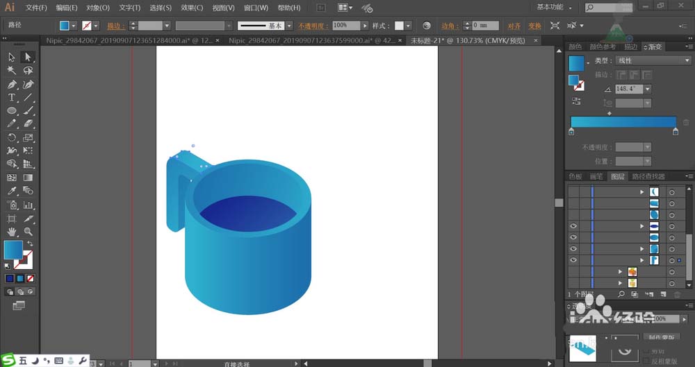 3、罐体的内部用深蓝色的渐变填充,手柄也用两种不同角度的蓝色渐变填充。顶端为高光,左侧为暗光。