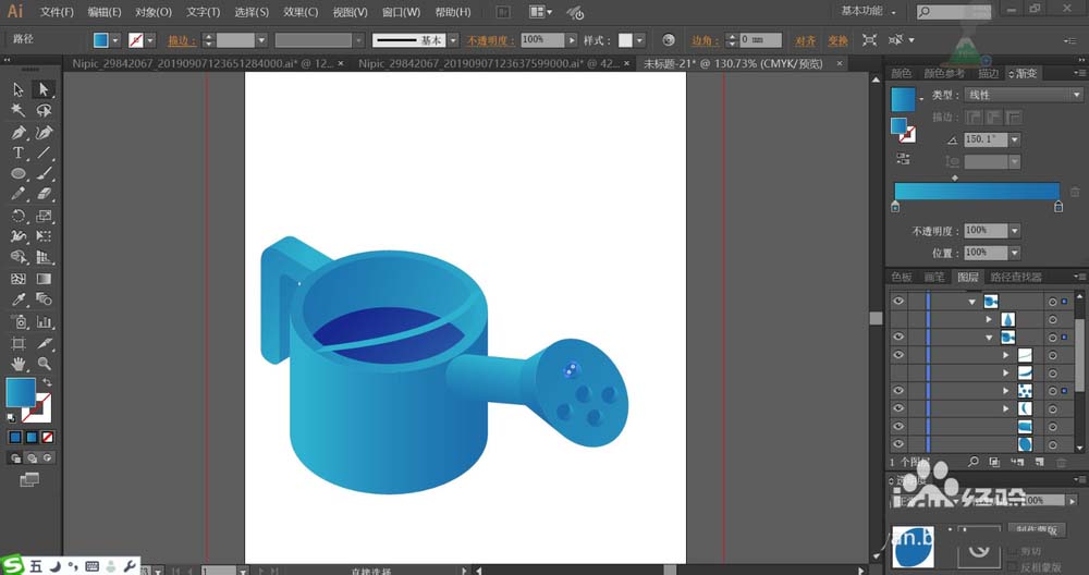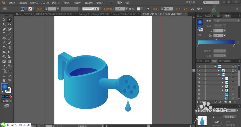 6、我们用径向渐变的蓝色填充从喷嘴向下滴出的水滴,再用钢笔把花洒右侧的书本与树苗一一绘制出来。
