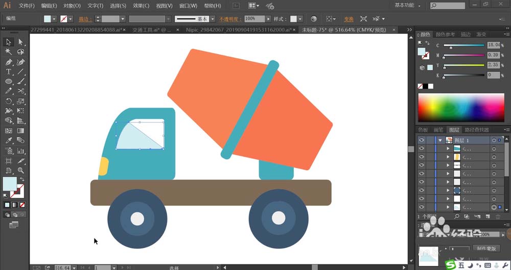 7、最后,我们使用网格工具点击车窗做出天蓝色的渐变,点击车轮做出蓝黑色的渐变,点击前车灯做出黄白色的渐变效果,完成水泥车图片设计。