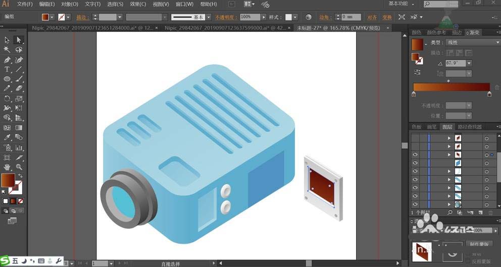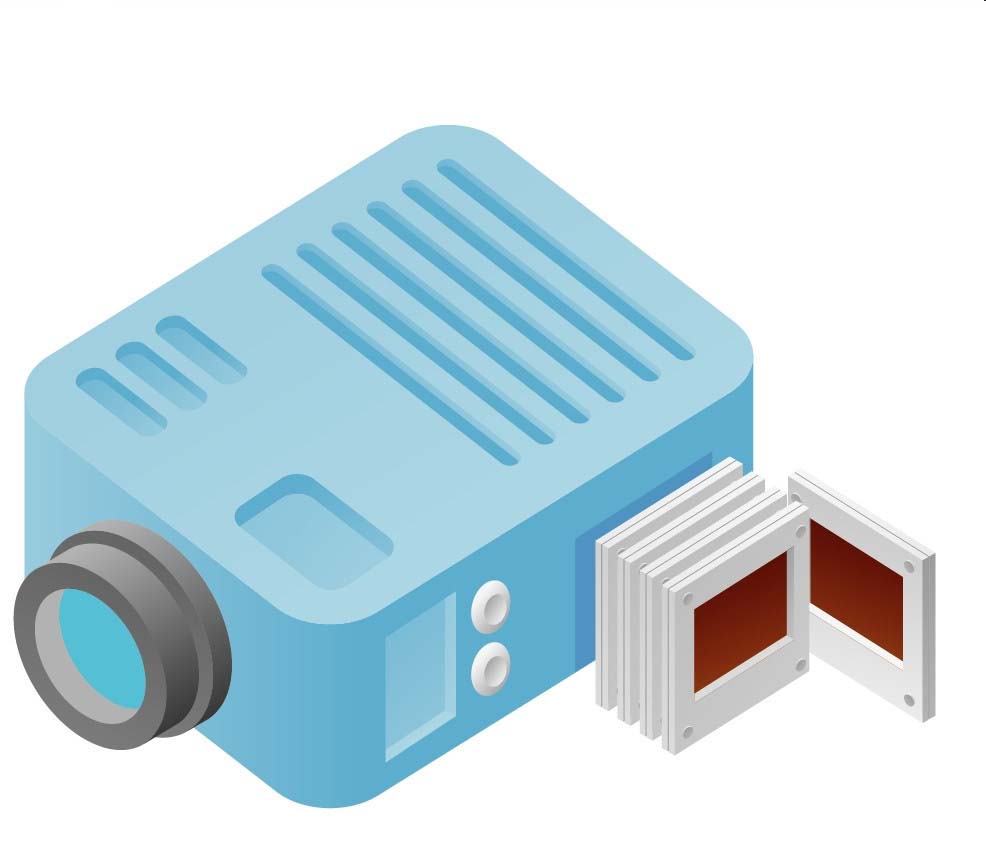 7、最后,我们继续画出投影仪右侧面的所有的胶片元素,在投影仪右侧上画出胶片的阴影,我们用深蓝色的渐变填充,完成投影仪图片设计。