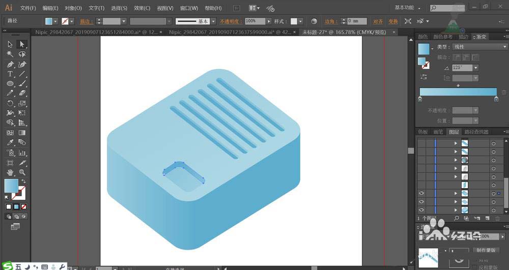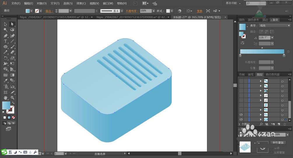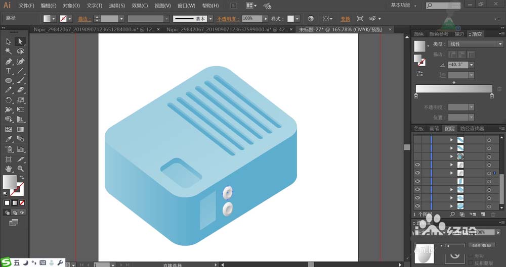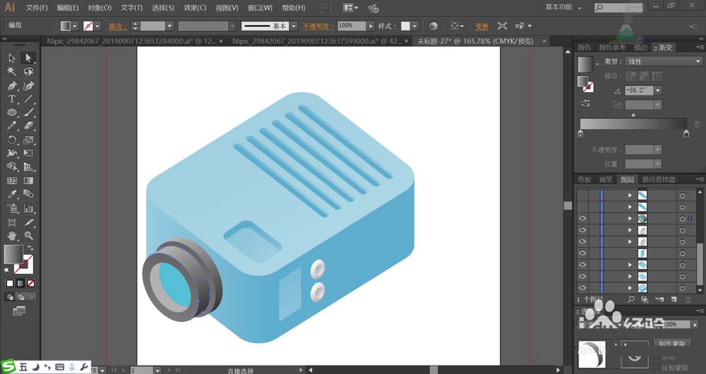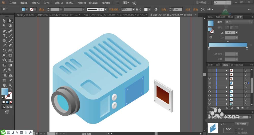 2、使用不同角度的蓝色渐变搭配填充投影仪的顶端、左右侧面,让顶端为高光。顶端的条纹用角度不同的蓝色渐变搭配填充。在投影仪的顶端的凹处用明暗两种蓝色渐变填充,让暗光为侧面,底部为高光。