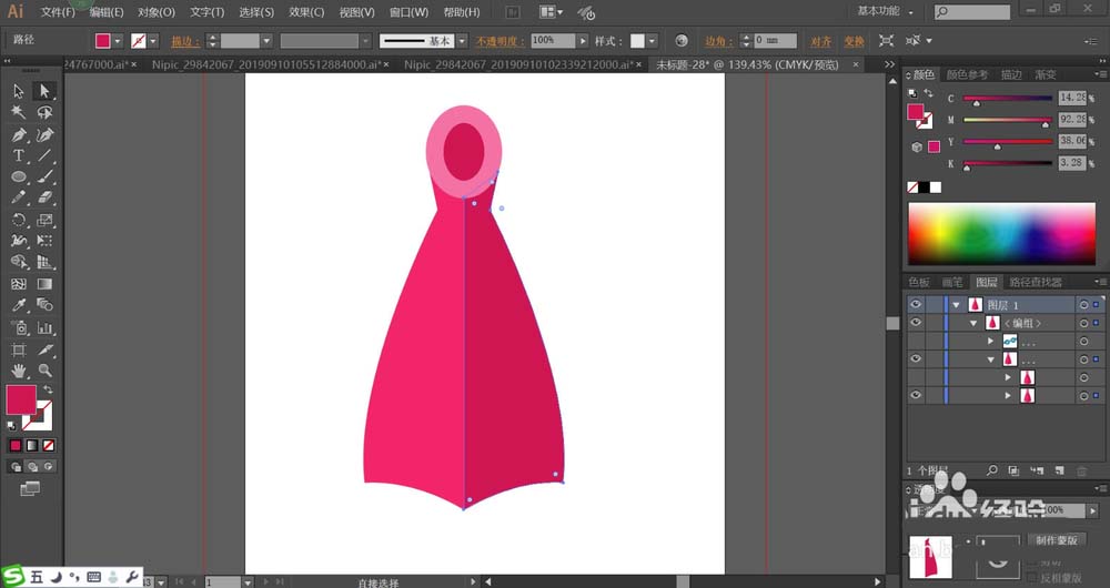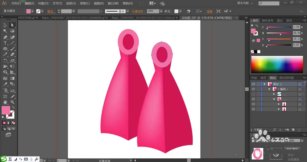 3、使用桃红色与大红色分别填充脚蹼的上方的椭圆形状的外边缘与内部路径。