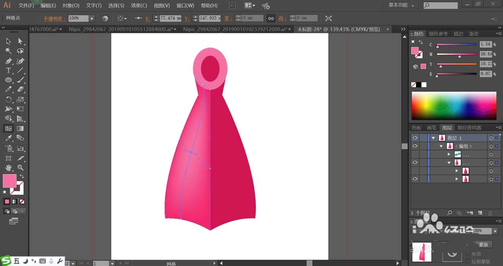4、使用网格工具点击一下脚蹼的高光区域,我们制作大红色的渐变效果呈现高光效果,制作完成一只脚蹼之后,我们再复制出另外一只放在右侧。
