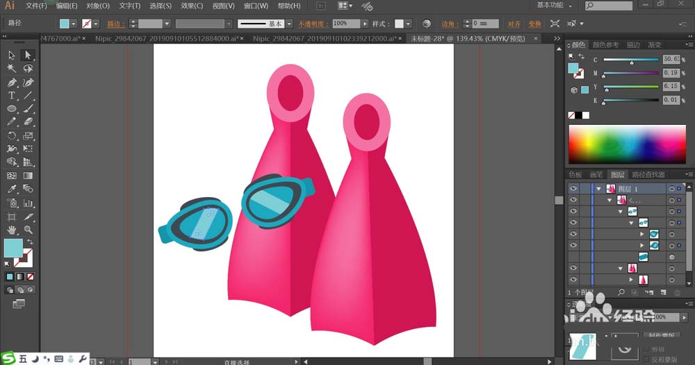 1、先用钢笔画出脚蹼的基本轮廓,再画出潜水镜的基本轮廓,我们把不同的色彩绘制出不同的路径。