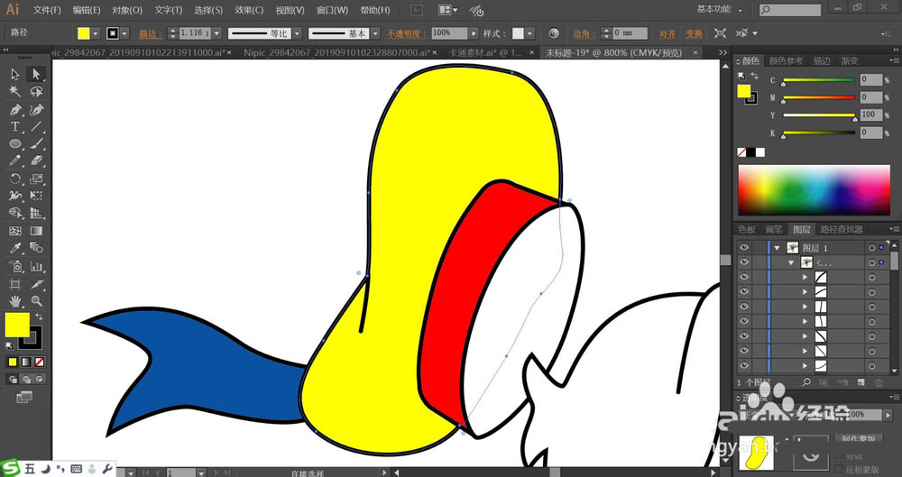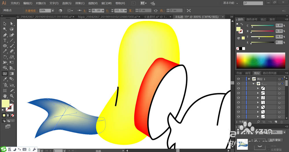 5、鸭子的嘴巴用黄色与橙色搭配填充外部与内部,舌头用红色填充,我们使用网格工具点击一下鸭子的嘴巴让其呈现黄色渐变的效果。