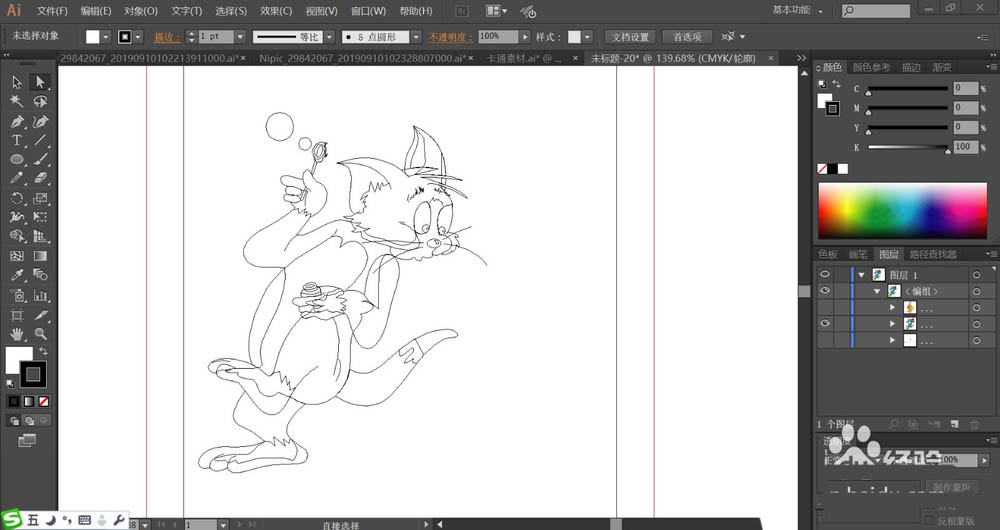 2、接着,我们用钢笔画出老鼠拿着圆环的动作,重点绘制出老鼠的表情与动作,还有手里的圆环的细节路径。