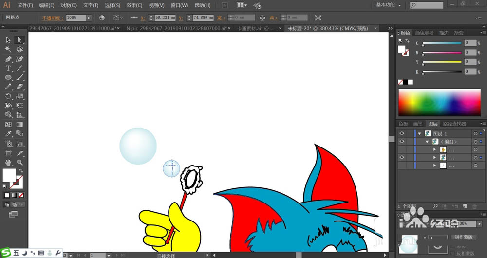 3、使用蓝色填充猫的头部与手臂,再用红色填充猫的耳朵内部,使用黄色填充猫的手臂。使用天蓝色填充空中的气泡,再用网格工具点击一下气泡让其呈现天蓝色的渐变。
