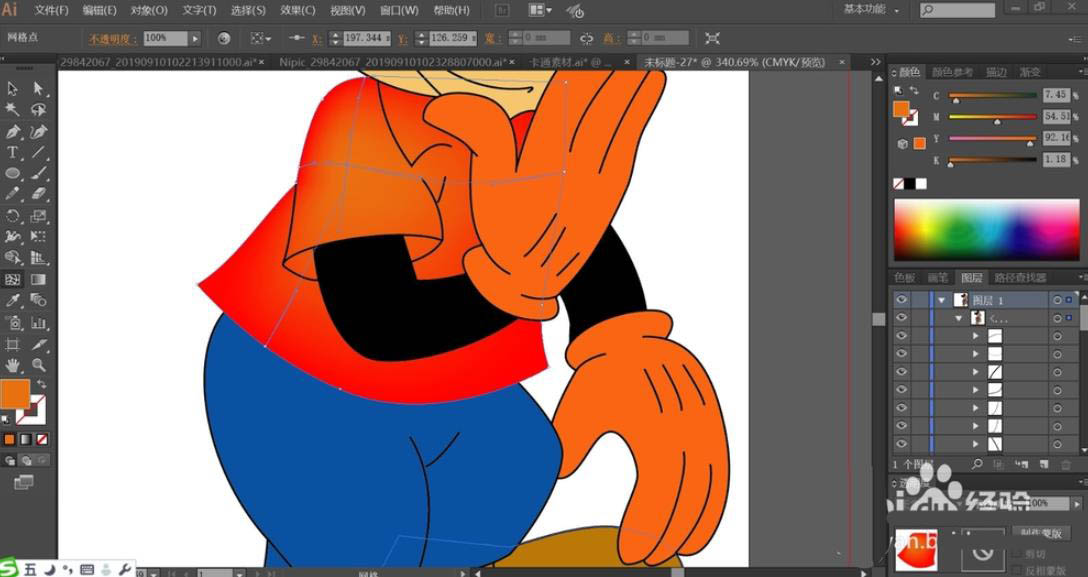 5、使用网格工具点击一下老鼠的衣服让其呈现红橙色的渐变效果,继续使用网格工具点击一下老鼠的裤子让其呈现蓝白色的渐变效果。