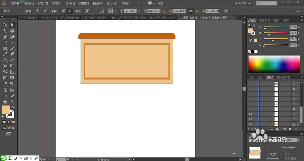 3、使用网格工具点击床架上方的结构件让其呈现木材质所有的褐色渐变效果,再用土黄色填充大床的正面矩形床架。
