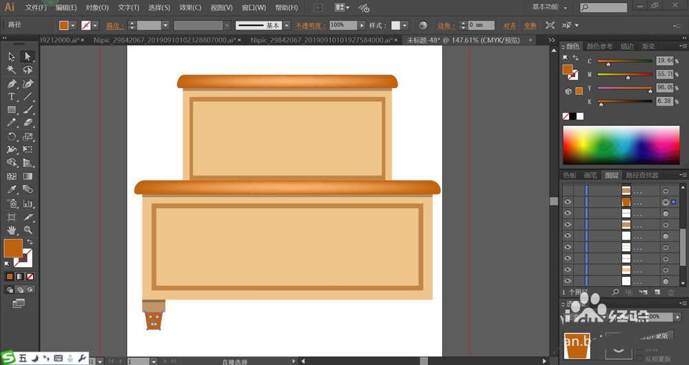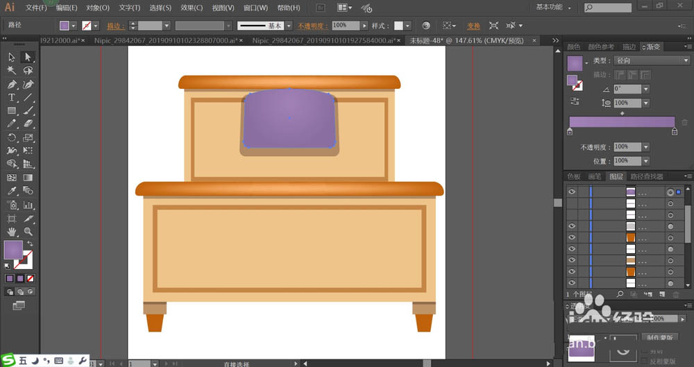 4、使用相同的方法让正面的床架上方呈现木材质的褐色渐变,再用褐色与棕色搭配填充床架下方的支撑脚。