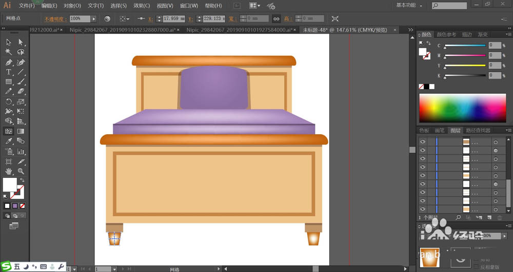 7、最后,我们用网格工具点击一下大床上面的被子的顶端与正面让其呈现蓝紫色的渐变效果,完成大床家具设计。